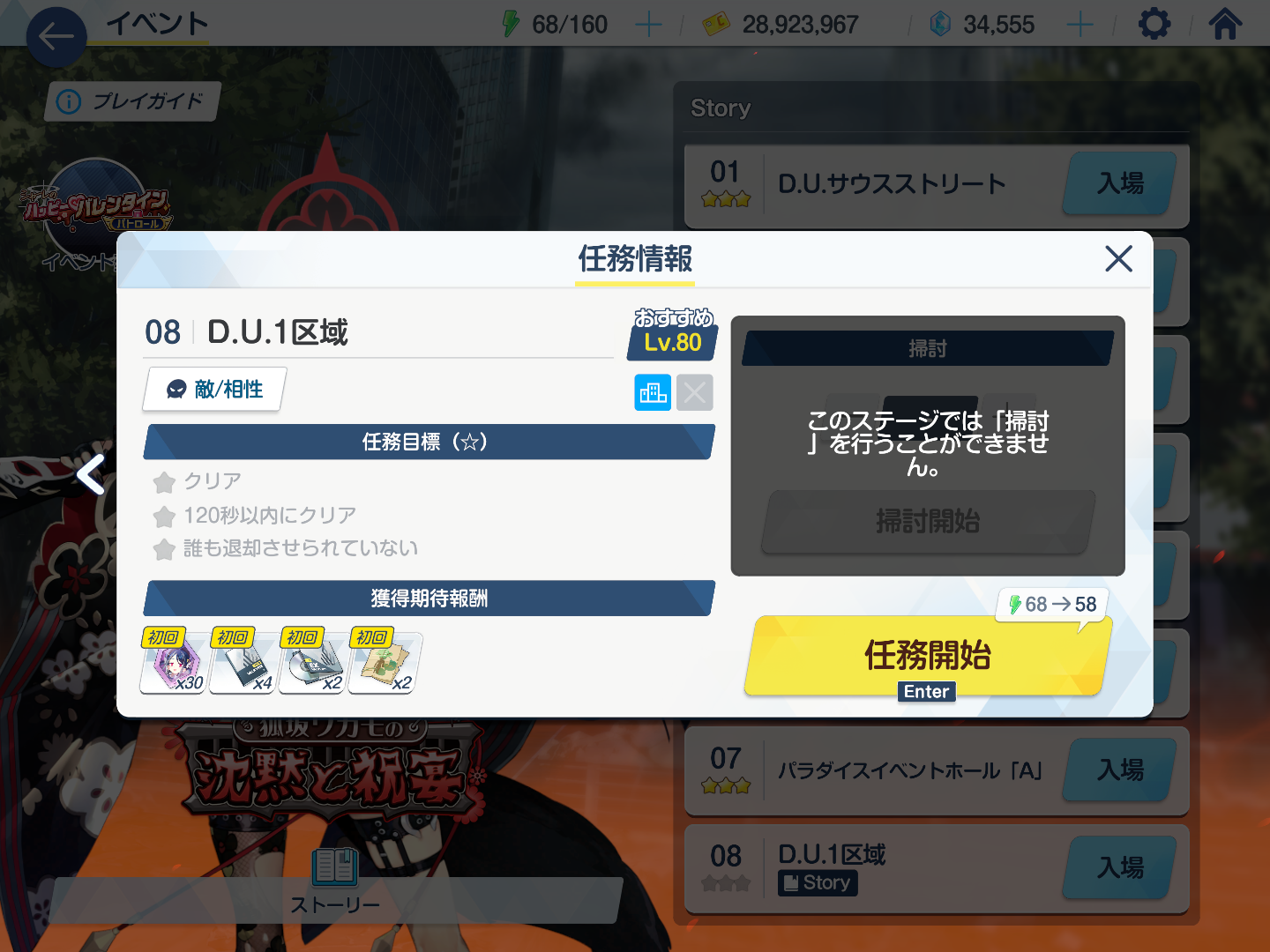 아마 튜토리얼만 끝나도 바로 열릴 거고, C 난이도의 경우 추천 레벨이 80대이긴 하지만 조력자 학생을 한 판에 3명까지 빌릴 수 있으며, 데카그라마톤 코어 스킬들도 추가로 사용이 가능하므로 이것들만 활용해도 클리어가 충분히 가능한 수준. 이벤트 기간인 2월 12일까지 최대한 꿀을 빨아두는 게 좋다.